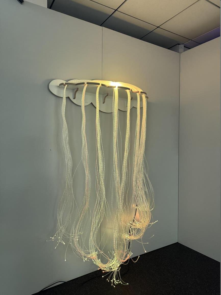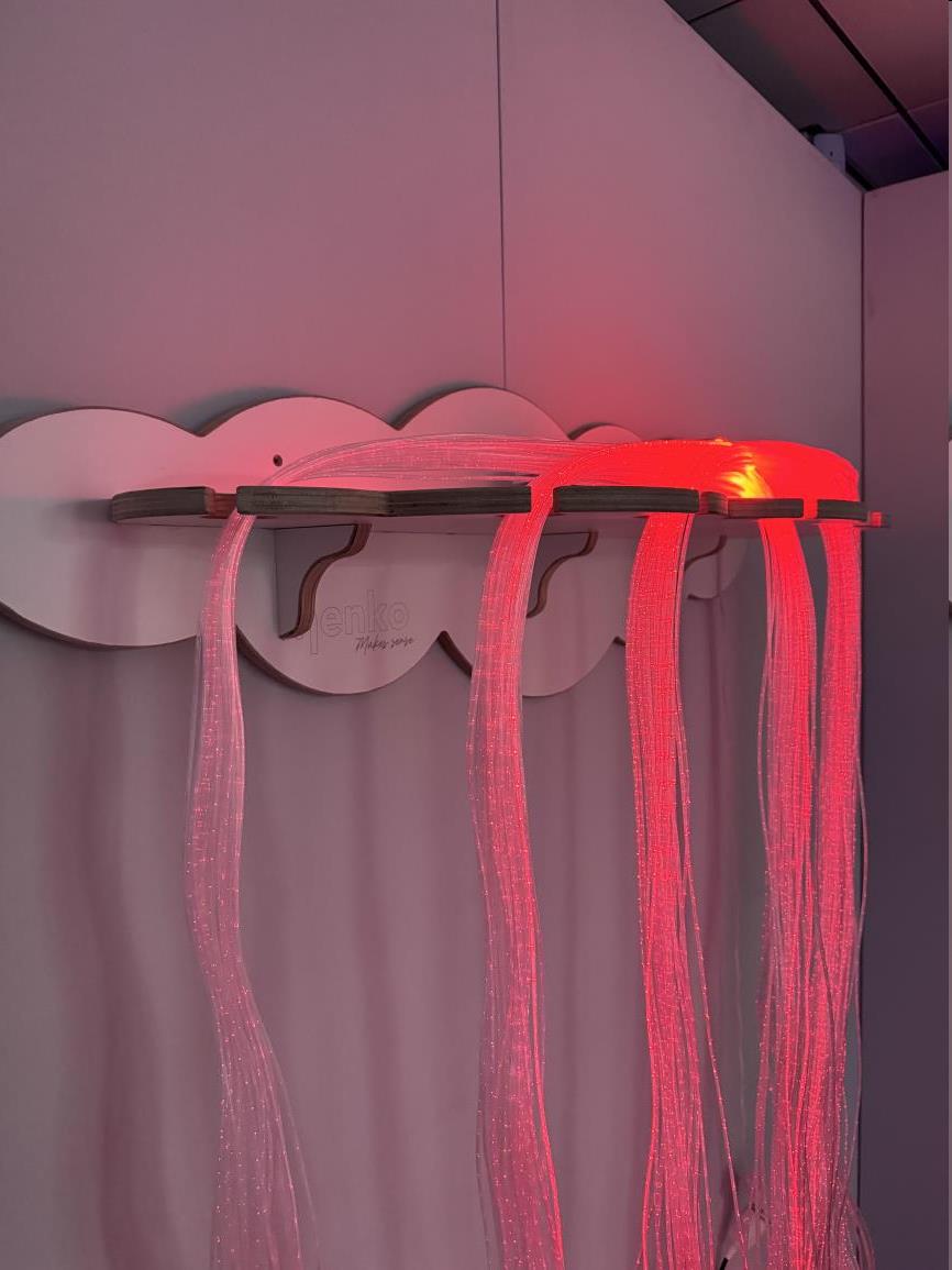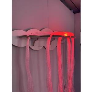 Make it warm and dreamy indoors with this complete set of fiber optic waterfall! With this shelf you can easily divide the fiber optic strands per bunch (openings are 2.5 cm in diameter). The 12mm thick shelf has 8 openings. Includes 2 wooden hanging hooks to attach to the wall. The fiber optic stra...