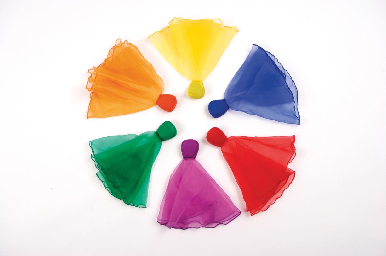 Colourful floating scarves with a weighted pouch, allowing them to fly smoothly and steadily through the air. This makes them easy to throw and catch.