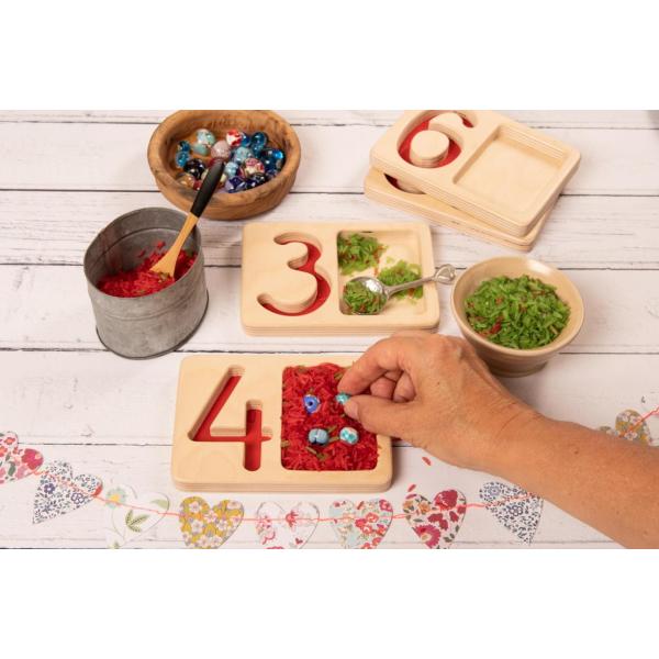 Discover an interactive approach to mastering mathematics with our number trays! These handcrafted wooden trays support the exploration and demonstration of the use of objects and numbers, enriching learning and deepening understanding.
