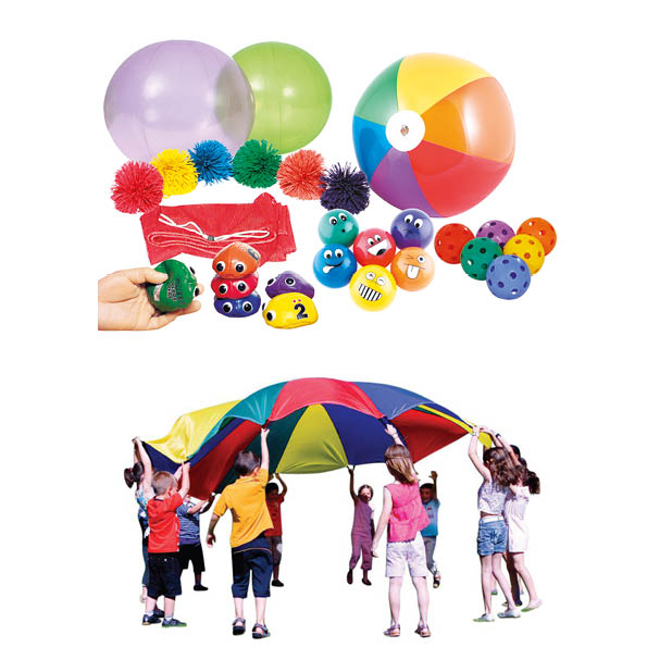 This set completes playing with a balloon cloth. This set consists of various balls which provide a nice effect in combination with a balloon cloth of 180 cm, size balls: 7 - 22 cm Made of nylon with coloured strips, supplied in a nylon storage bag. Execution depending on stock. With 12 handles