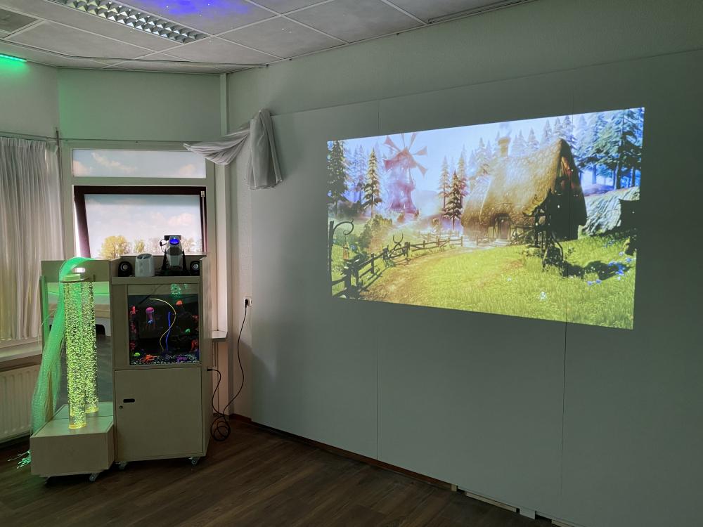 This room combines Sensory sessions with day care. In this project the theme of nature was an important criterion. For this reason, we worked with various natural art decorations, like wall and window stickers that represents a meadow. When you are in this room it looks like you are in the middle of a meadow. In this way, it seems to the client as if he/she is in a completely different environment, which brings enthusiasm.