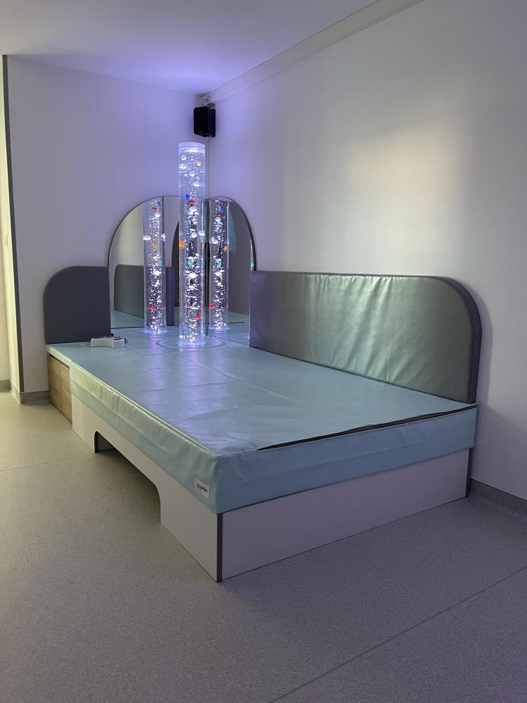 Regarding the upholstery, the sensory room is designed in two colors: ice blue and rustic grey.