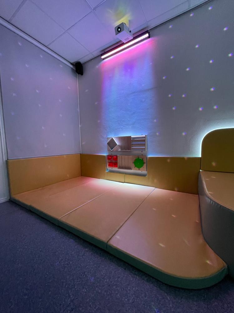 This former play area/storage room of game material got transformed into a sensory room with all facets within snoezelen.