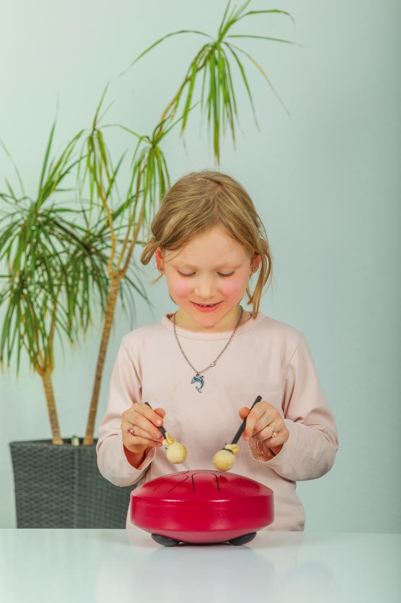 A steel tongue drum is a round hollow body made of steel. There are oscillating cut outs (tongues) on the surface, which are tonally coordinated (scale system) and whose sound is amplified by the sound box. The drums are very melodic and are known for their relaxing sounds and lightness of play, whi...