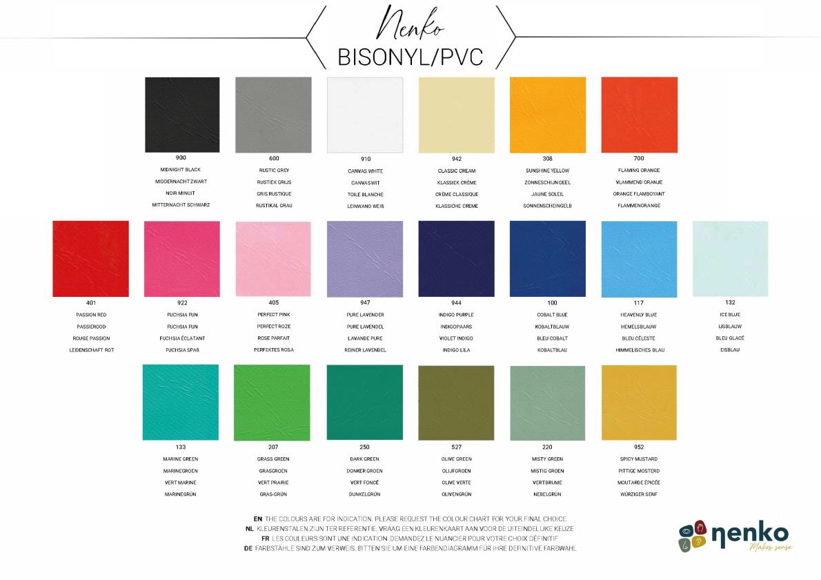 All bisonyl products can be cleaned with warm water and a mild soap (such as Andy or Ajax, etc.). Do not use aggressive cleaning products. Bisonyl cleaner is also available for more difficult stains.